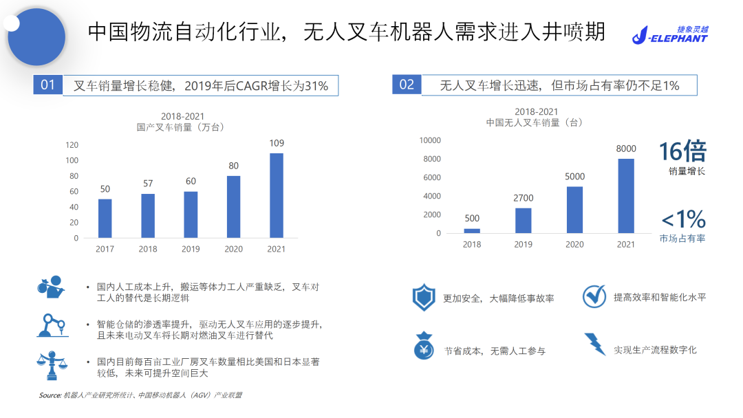 根据前瞻产业研究院数据,2021年全国叉车市场销量总共超过109万台,而其中叉车式AGV仅8000台左右,占比不足1%。