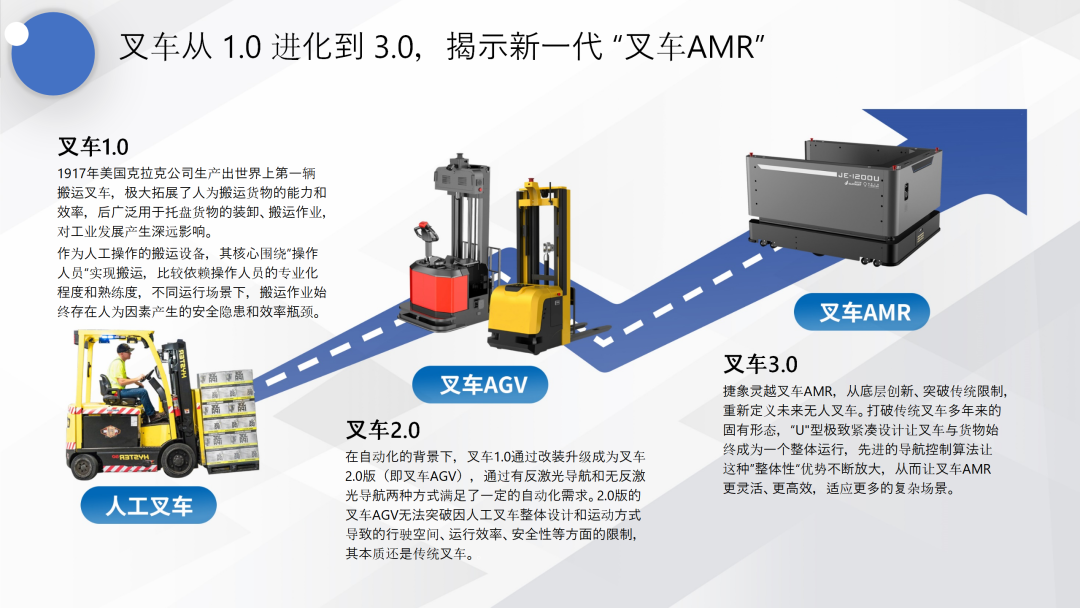 如果把人工操作的搬运叉车称为第一代,那么在此基础上通过加装传感器而来的AGV(Automated Guided Vehicle)无人叉车,可以称作第二代。