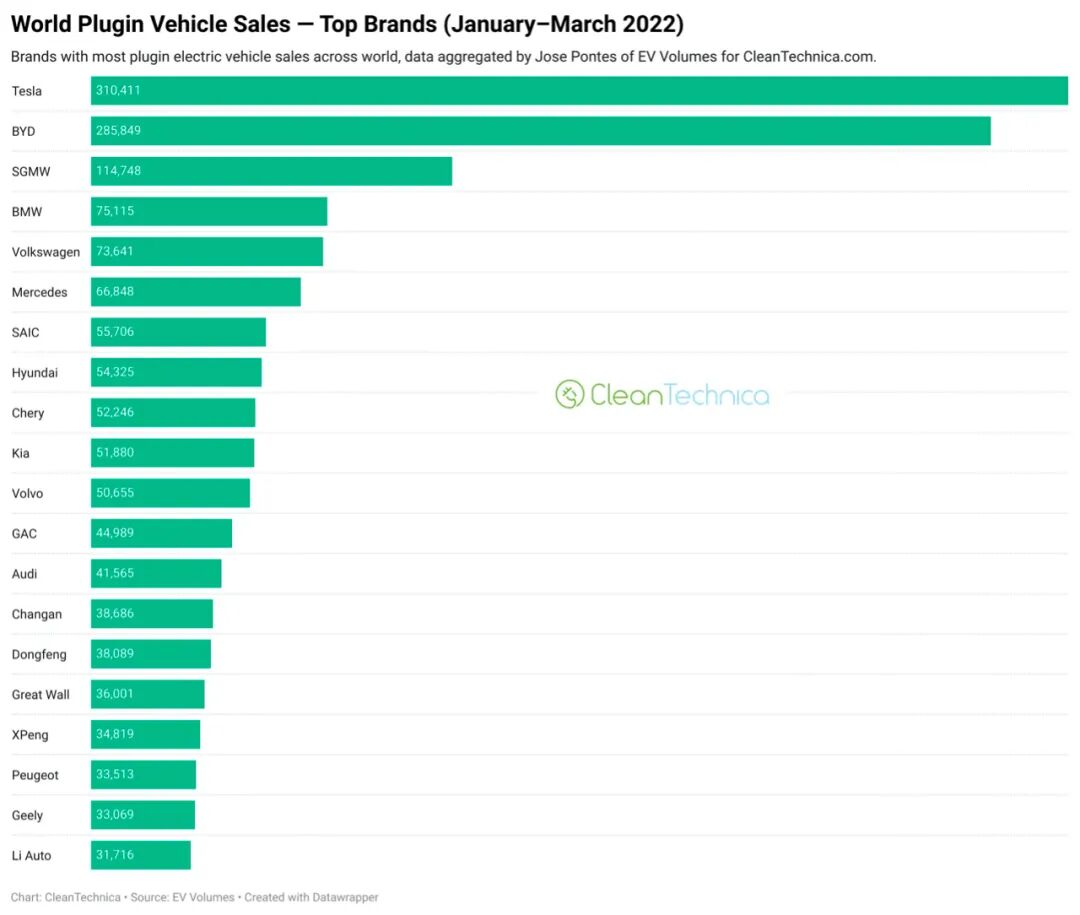 排名第一的是特斯拉,今年第一季度卖了310,411辆电动车,占200万辆总份额的15.5%。