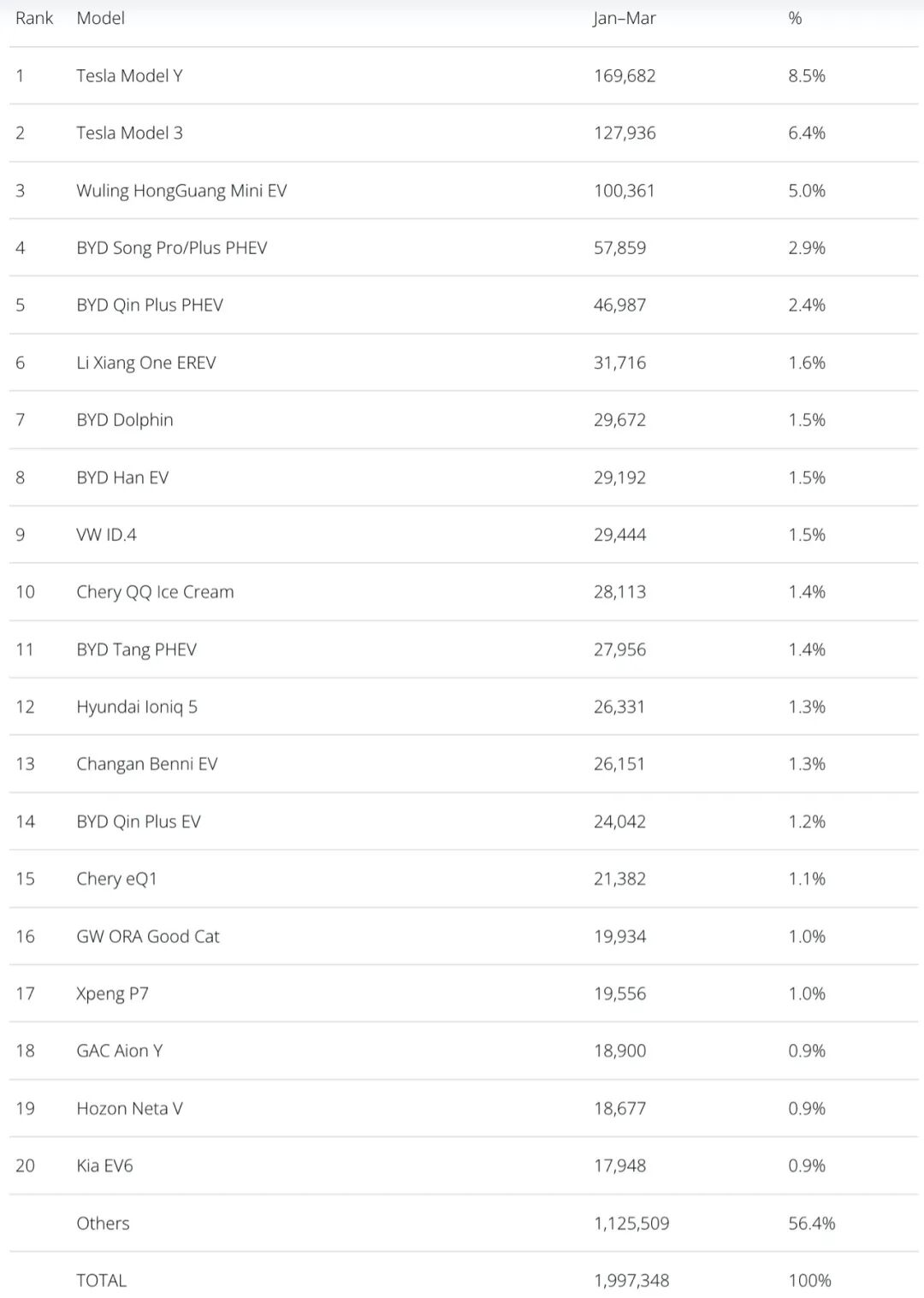 比亚迪排在第二位,一季度卖了285,849辆车(包括纯电、插混),占市场总份额的14.3% 。