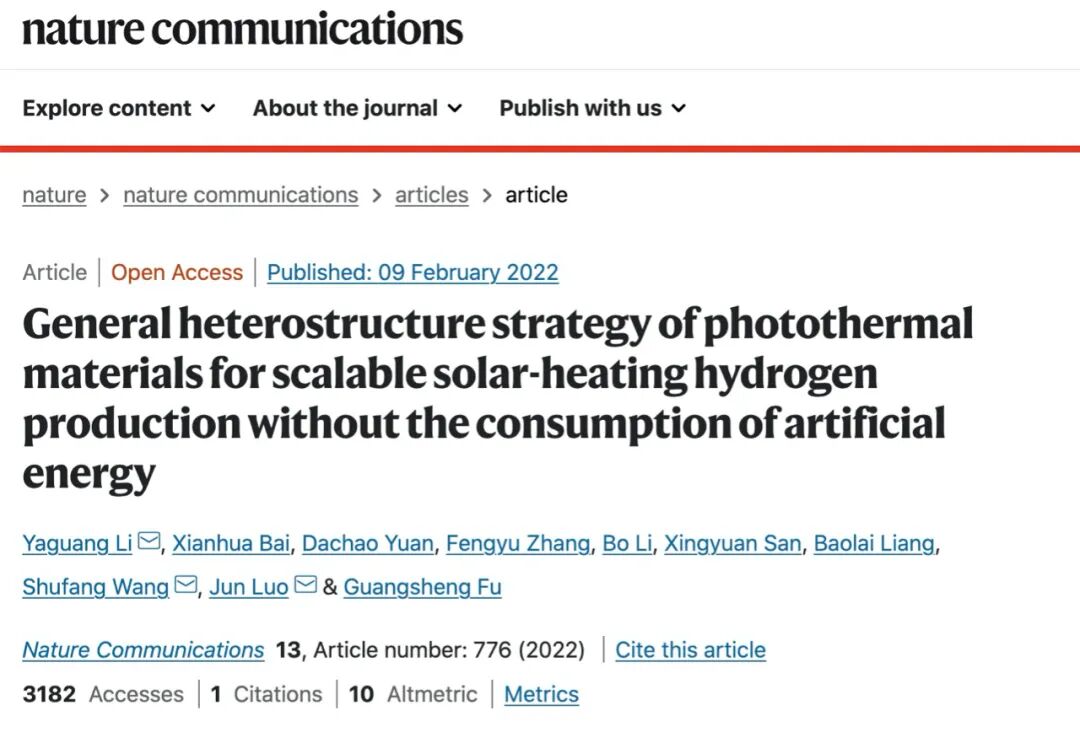 该论文发表于今年2月9日,标题为“光热材料的一般异质结构策略,用于可量产的太阳能加热制氢且不消耗二次能源”。