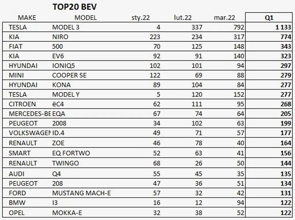 具体来看车型,第一季度电动车销量榜显示,特斯拉Model 3稳居第一,共卖了1133辆。