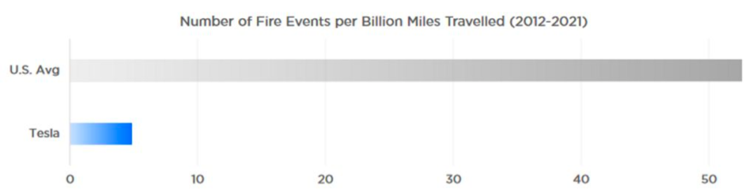 在2021年影响力报告中,特斯拉也谈到了这一点,从2021年到2021年,每行驶10亿英里,大约有5辆特斯拉汽车起火,而美国车辆的平均起火概率为53起。