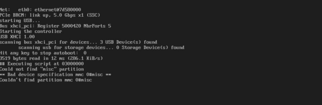 此时将树莓派4连接到计算机,应该会在显示屏上看到引导加载程序: