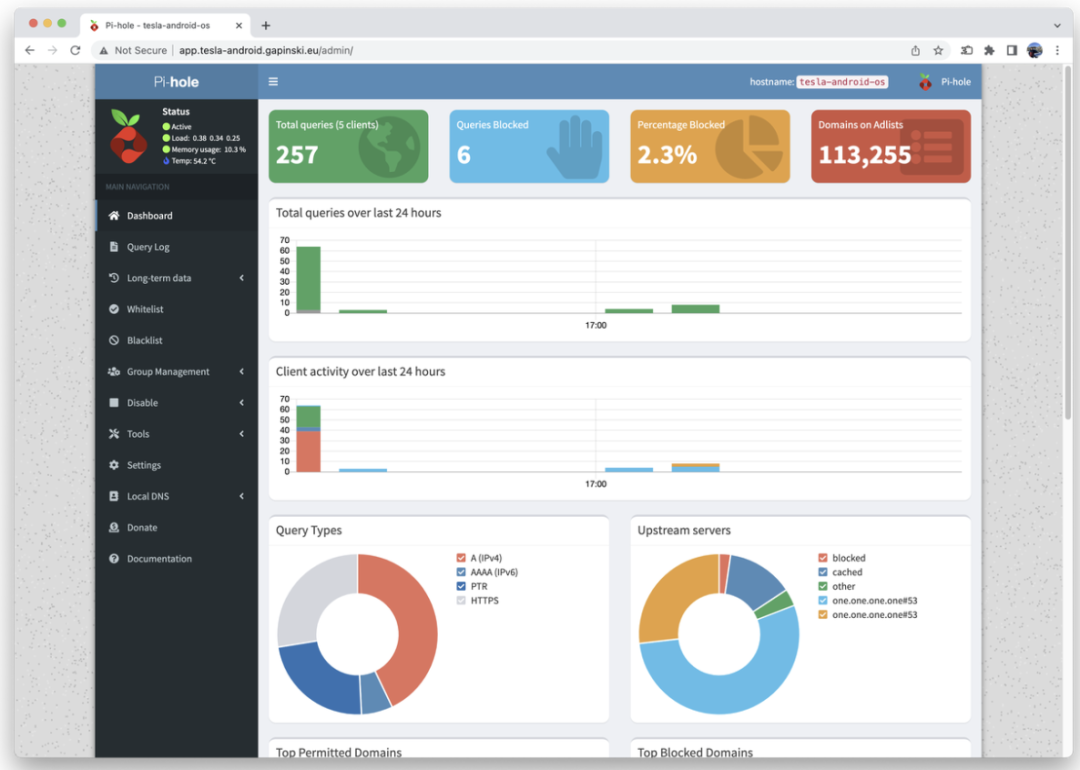 用计算机连接 Tesla-Android Wi-Fi ,打开 Chrome 并导航到http://3.3.3.1/admin/ Pi-hole 管理面板:
