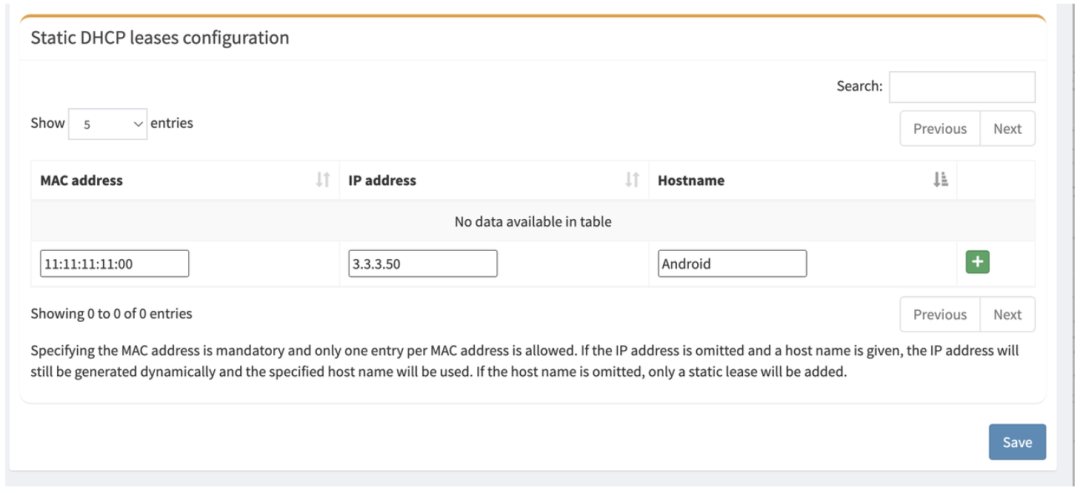 在设置菜单中选择 DHCP 选项,在“静态 DHCP 配置”下,输入之前记下安卓树莓派的物理地址: