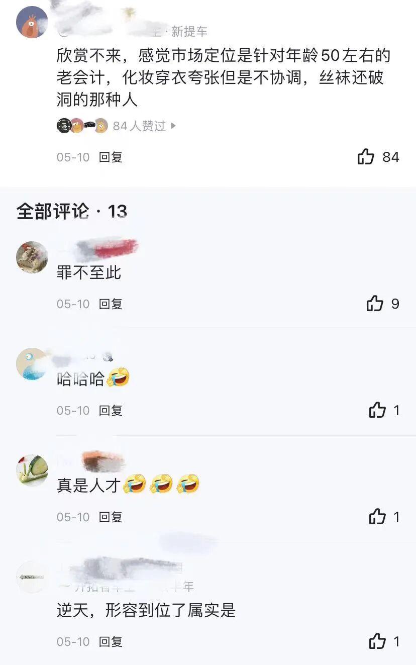 某网友对此车发表评论说:“欣赏不来,感觉市场定位是针对年龄50岁左右的老会计,化妆穿衣夸张但是不协调,丝袜还破洞的那种人。”