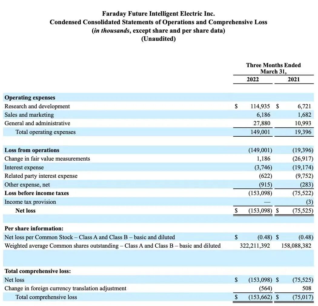 5月24日,法拉第未来公布了2022财年第一季度财报。