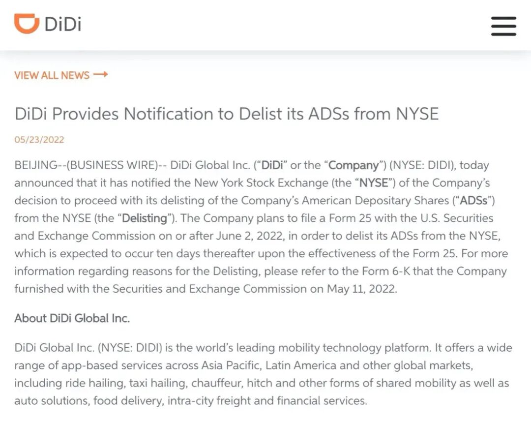 5月23日,滴滴举行临时股东大会,就美国自愿退市计划进行投票表决。随后,滴滴官网发布公告称,公司已经向纽交所发布了退市意向公告,并将推进退市的工作流程。
