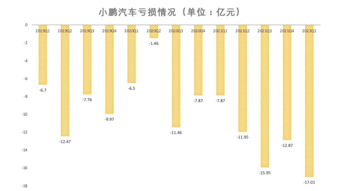 2022年Q1,小鹏汽车净亏损17亿元,创下上市以来亏损之最: