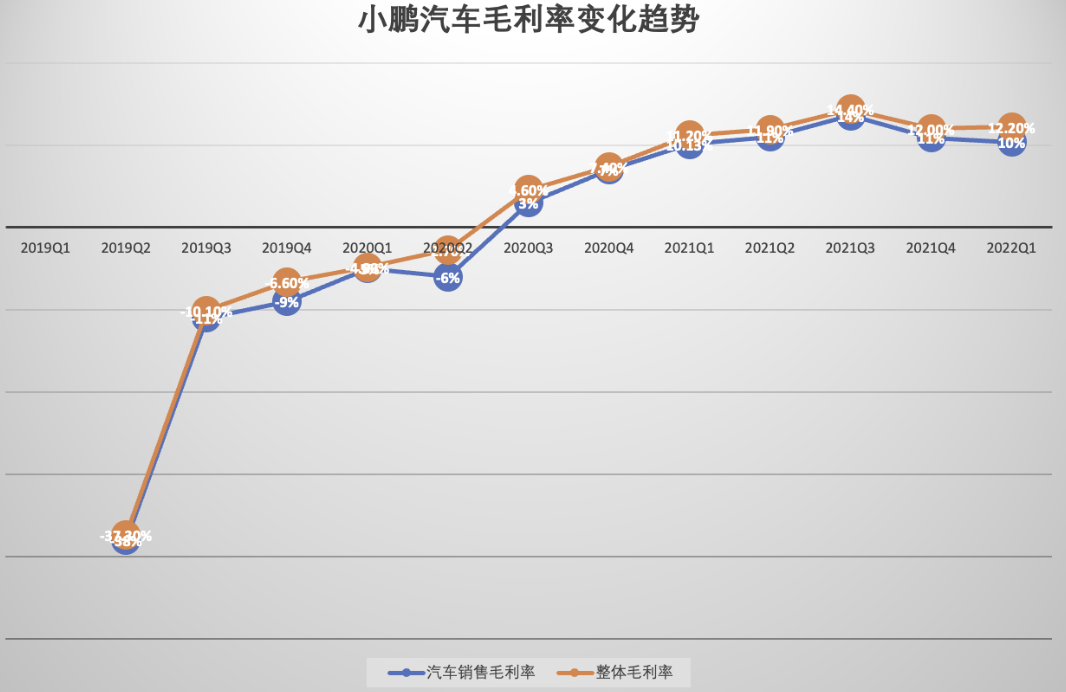比较小鹏一直以来的整体毛利率和汽车销售毛利率就能发现,这两条曲线的起伏趋势完全一致。