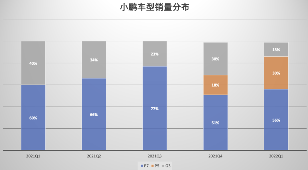 2022年Q1,小鹏汽车共计交付了34561辆车,其中P7是交付主力,占比56%,而售价更低的P5增长很快,贡献了30%的销量: