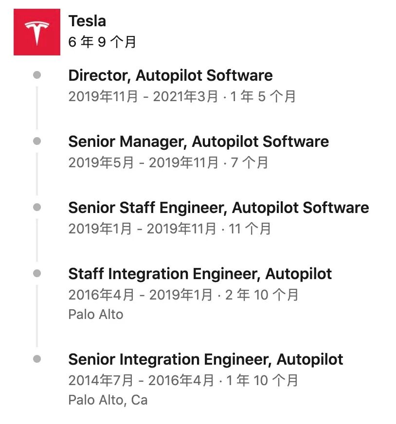 他从2014年入职特斯拉,最初的职位是高级集成工程师,后来一路攀升,最后成了特斯拉AutoPilot软件负责人,主导特斯拉自动驾驶软件的开发。