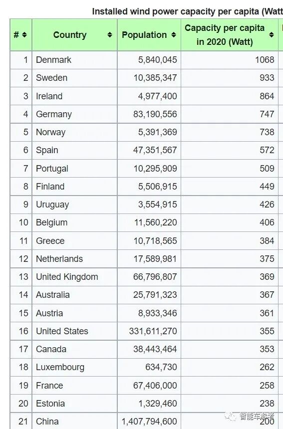 但也有网友在底下留言:“从2020年的人均风电装机容量全球排名来看,中国并没有排在第一,而是排在了第21名,美国也不是排第二而是第16名,前20名里只有4个不是欧洲国家。”