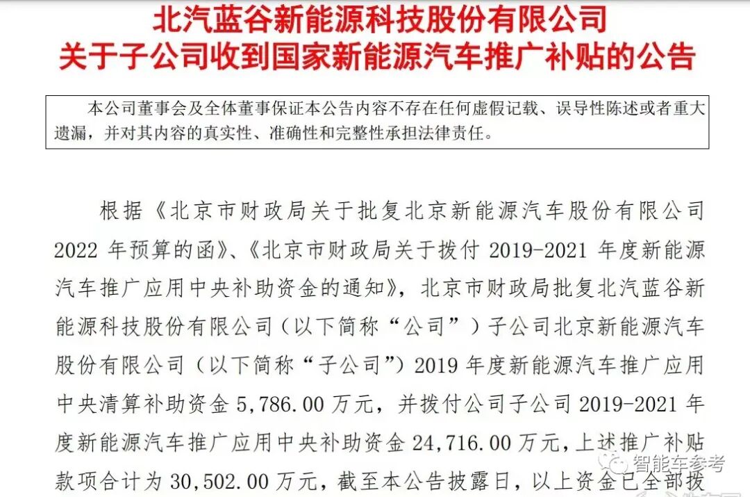 5月29日,北汽蓝谷公告显示,其子公司——北京新能源汽车股份有限公司收到了合计3.05亿元的新能源汽车推广补贴,这笔资金由北京市财政局批复。