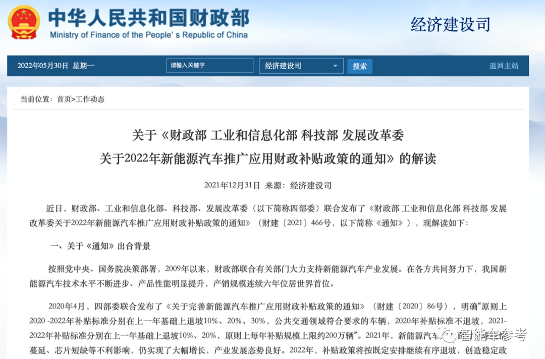 值得一提的是,2021年12月31日,财政部发布了《关于2022年新能源汽车推广应用财政补贴政策的通知》,通知显示我国新能源汽车购置补贴政策将在2022年12月31日正式终止。