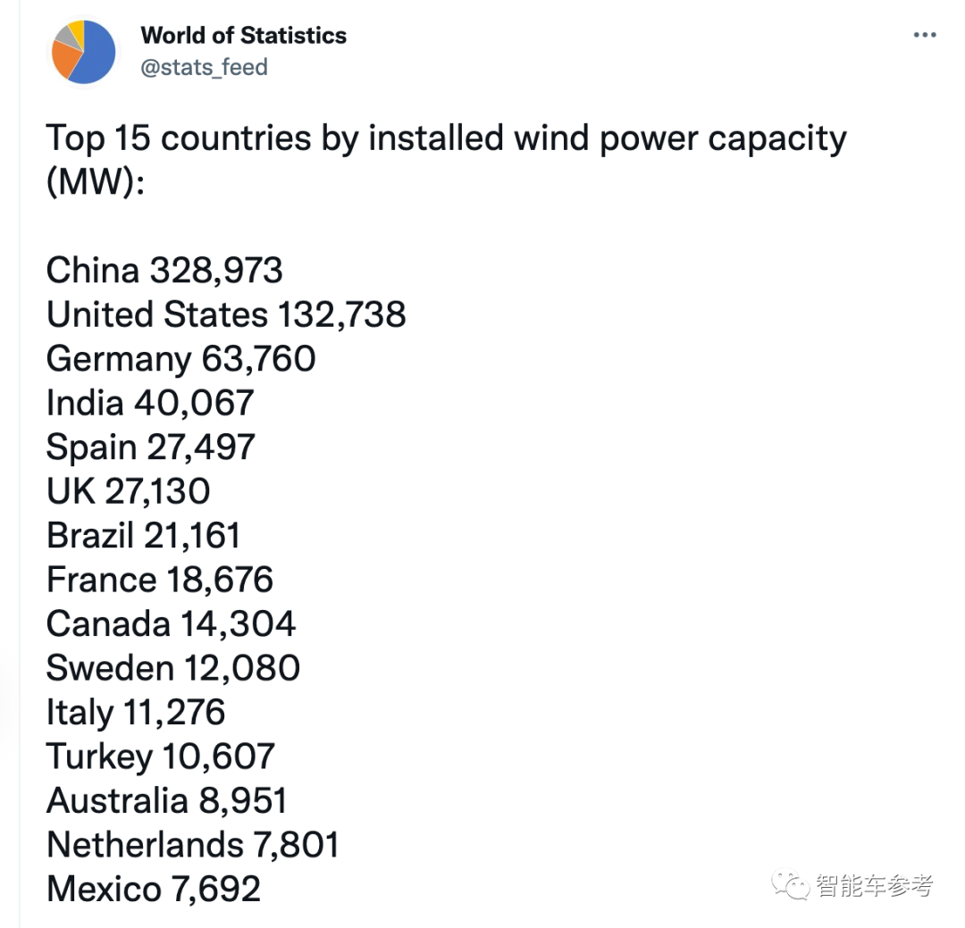 5月30日,推特用户公布了风电装机容量排名前15位的国家,中国以328,973兆瓦排在第一位,是排在第二位的美国的两倍多。