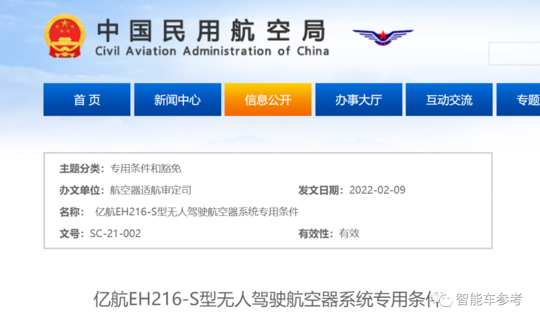今年2月份,中国民航局在经过近一年的评审之后,针对亿航智能飞行汽车,发布了《亿航EH216-S型无人驾驶航空器系统专用条件》,对飞行汽车的性能、结构、设计以及空管等方面做出规定。