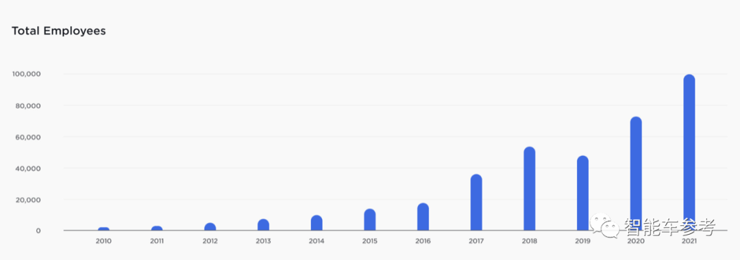 其实从2019年至2021年,特斯拉员工团队一直在快速扩张,分别为48016人、70757人、 99290人。