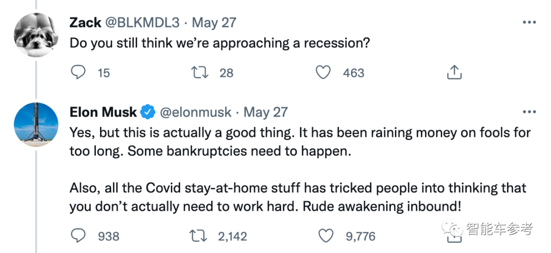 此前5月底,马斯克曾在推特上表示对经济前景的看法,他说美国经济衰退将持续12至18个月,并称这实际上是一件“好事”。