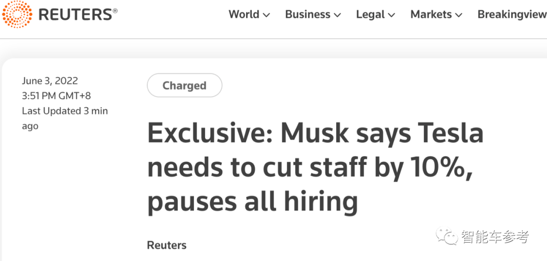 6月3日,路透社报道称,马斯克给特斯拉高管发了一封内部邮件,信中表示他对当前经济状况很不乐观,为此要裁掉特斯拉10%的员工,并暂停全球招聘。