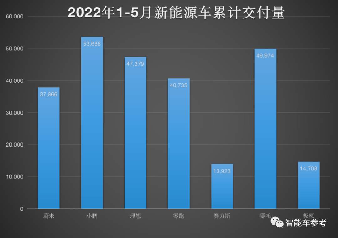 单看今年1-5月累计交付量的话,五家中小鹏排名第一,共交付了53,688辆,而蔚来排在最后,到目前为止交付了37,866辆。