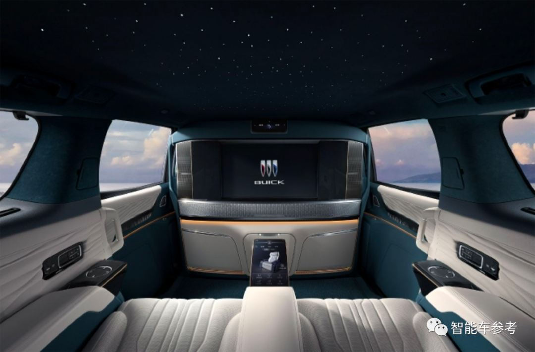 内饰方面,后排采用独立座椅,中央有宽大的扶手,并且配有航空头枕及腿拖。后排与前排之间还配有一键可升降的幕墙系统,支持多模式智能投屏,以及还配有星空车顶以及车内氛围灯。
