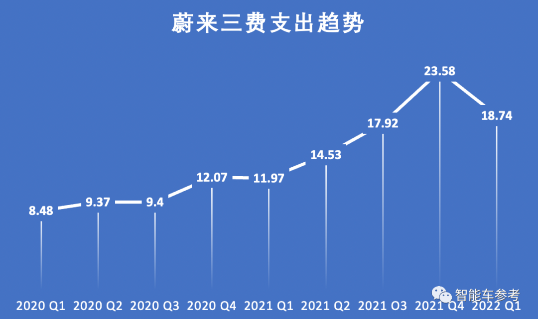 其中三费支出18.74亿元,较上个季度降低近5亿元,这也自2020年第一季度以来,蔚来第一次在这个项目上出现这么大幅度的削减。