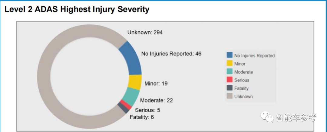 第五是伤情。L2级方面,已知的98起事故中,有6起致死、5起严重受伤、22起中等伤情、19起轻微受伤、46起未受伤、294起伤情未知;