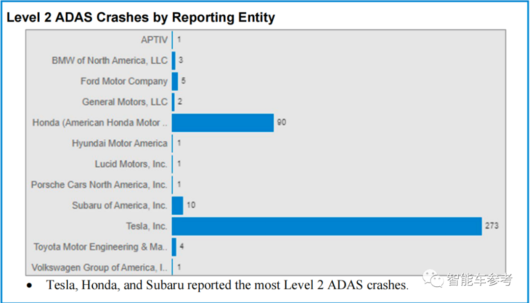 NHTSA把统计口径分成两个,一个是L2级方面,就是前面说过的特斯拉、本田和斯巴鲁等等,此外还有福特、丰田、宝马、通用、大众,但这几个碰撞次数都仅限个位数;