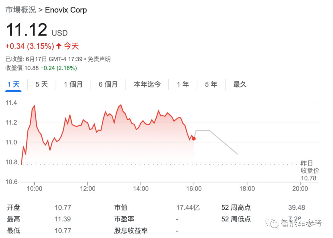 2021年2月,Enovix通过SPAC合并借壳上市,融资金额4.05亿美元,估值11亿美元。截止到上周五,Enovix股价报11.12美元/股,市值达到17.44亿美元。