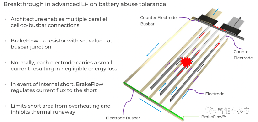 具体来说,就是在多个电池板叠加的情况下,在连接每个单元的母线设定一个固定的电阻,这样在内部短路的情况下,就可以通过BrakeFlow调节通过短路处的电流,限制让短路区域过热出现热失控的情况。