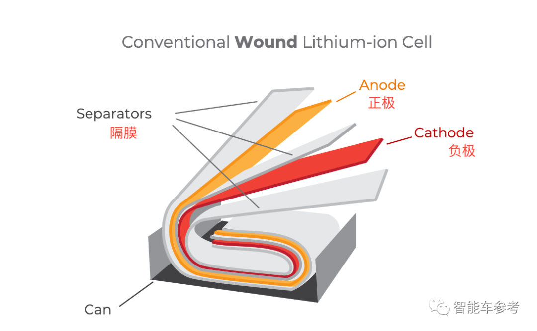 先说传统的缠绕式电池结构,是将电池正负极以及隔膜叠加起来,然后像卷纸一样卷起来,差不多就是下面的样子: