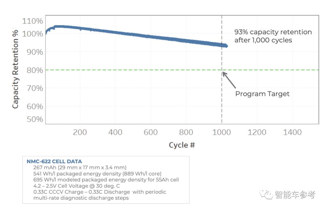 1000次循环后电池容量还能保持在93%,而目前主流的三元锂电池1000次循环后,容量只能剩下80%左右。