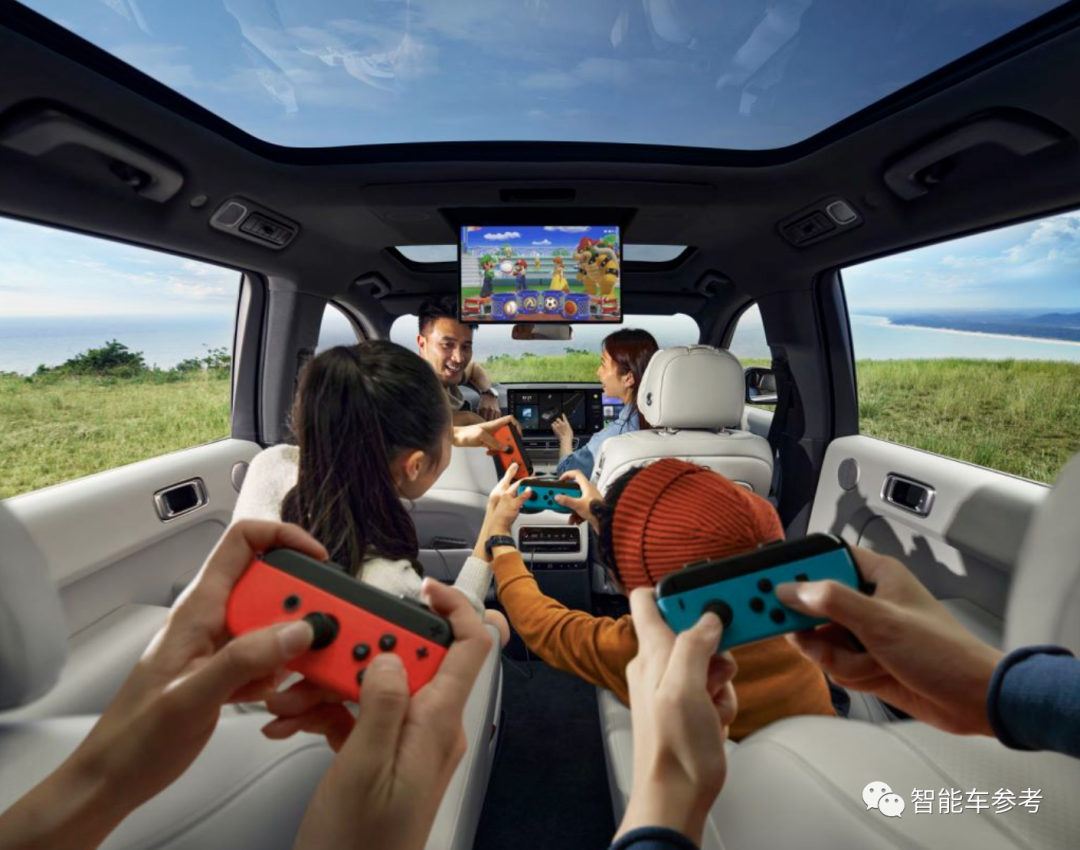 首先是车顶给二三排乘客一个独立的影音娱乐大屏,而且和车上传感器联通,乘客可以通过语音手势直接控制。