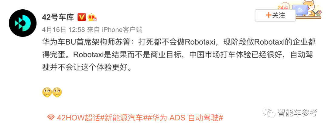 华为智能汽BU ADS智能驾驶产品线总裁苏箐,在回答RoboTaxi问题时,竟然给出了“现阶段做RoboTaxi的企业都得完蛋”这样的评价。