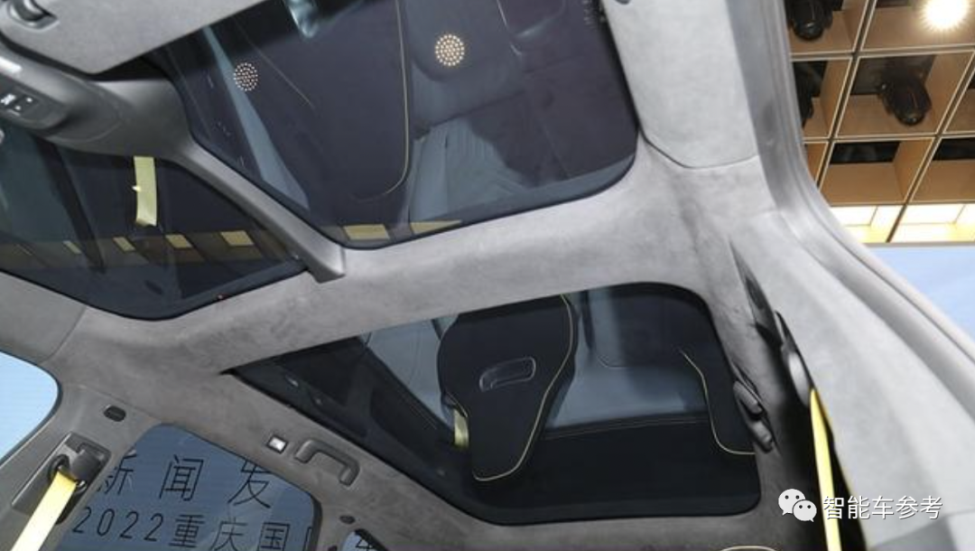 其他已经透露的配置还包括:NAPPA真皮座椅、麂皮顶棚、4座/5座布局,座椅通风加热按摩、车内主动降噪技术、还有一块别致的分区全景天窗: