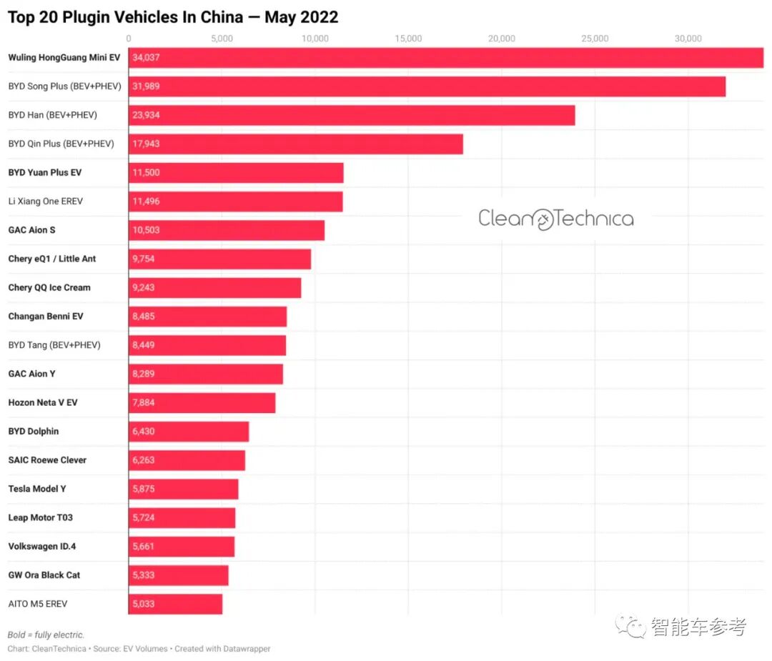 接下来再来看5月畅销榜TOP20,排在第一的仍是五菱宏光Mini EV,5月销量为34,037辆;比亚迪宋Plus(包括纯电和混动)、比亚迪汉(包括纯电和混动)拿下第二、第三名。
