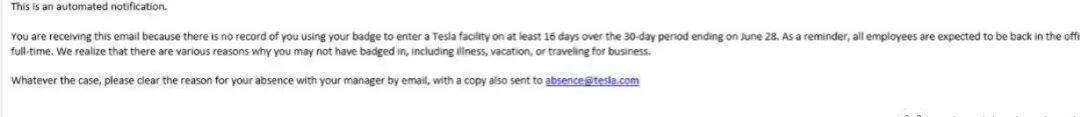 除了这两条帖子外,一个月前特斯拉员工还被警告每周必须在办公室工作40小时,否则辞职走人。