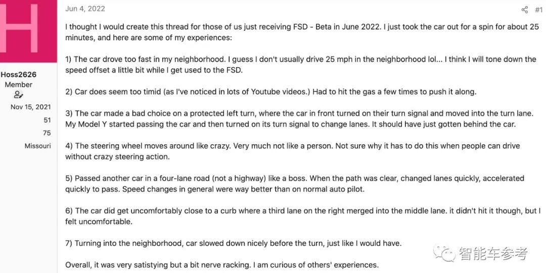 还有网友细致罗列了各种缺点:“车开得太快”、“有时候又太胆小”、“方向盘发疯似地转来转去,一点都不像人”、“变速这一点比Autopilot做得更好”、“让我有点焦虑紧张”。