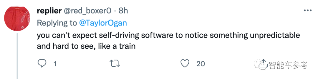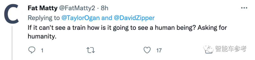 又比如“你不能指望自动驾驶能注意到这些突然出现、很难识别的物体,比如这台电车。”