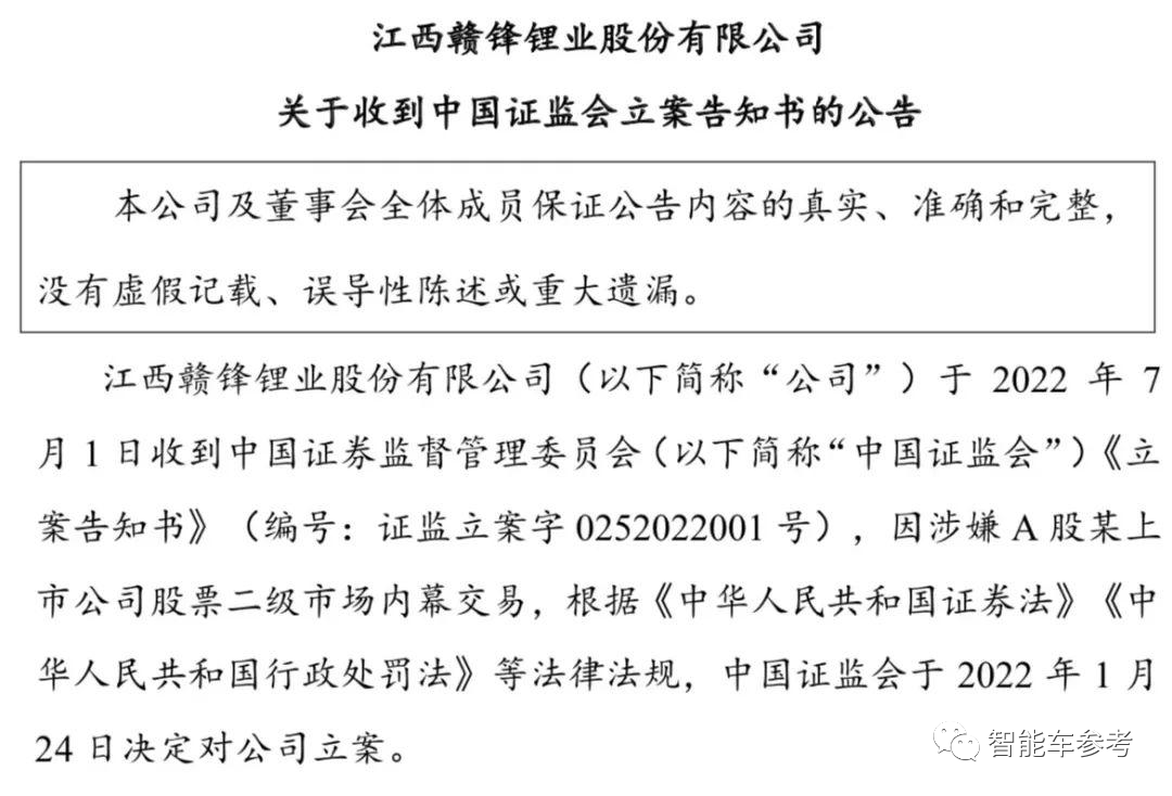 按照赣锋锂业表述,1月证监会已立案,调查内容是涉嫌A股某上市公司股票内幕交易,而7月1日公司收到《立案告知书》。