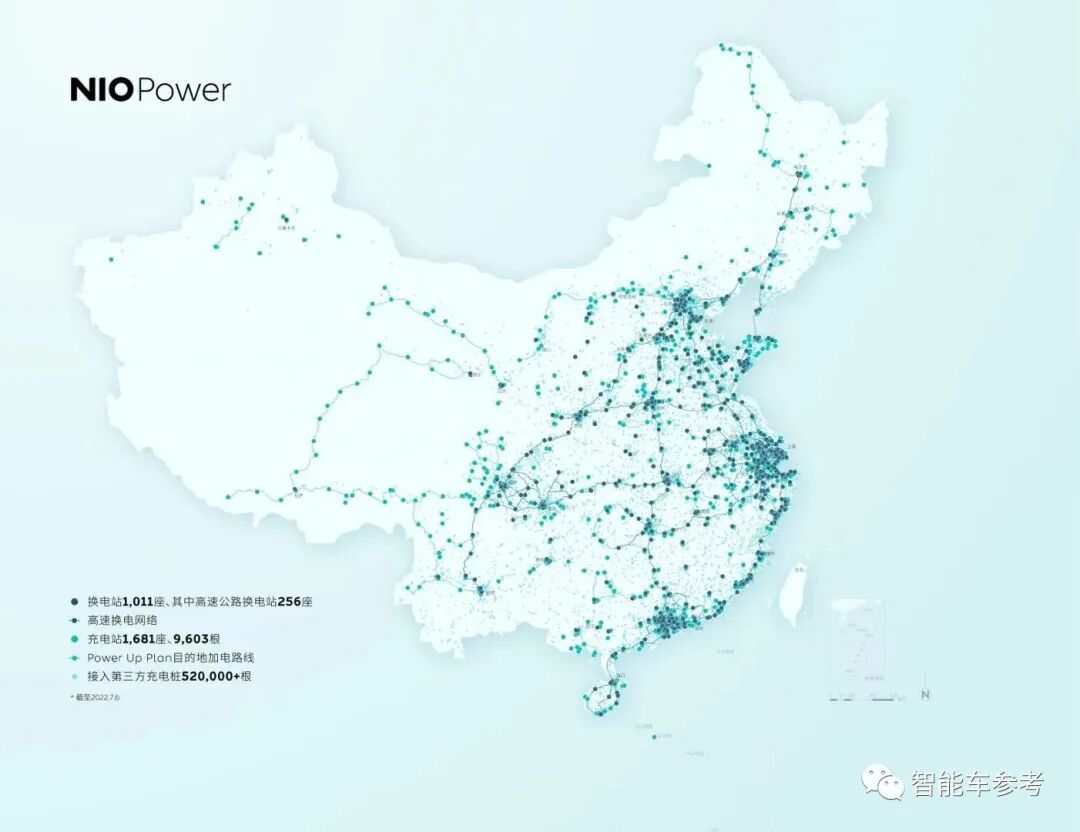4个方向的布局下,蔚来现在在国内一共有1011座换电站、9603根充电桩(80%的电充给非蔚来电动车)、520000根三方桩(App内接入)。