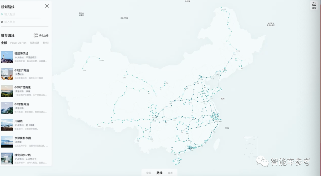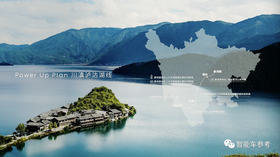 第三种补能场景,叫做目的地加电路线,简单理解就是热门景点、自驾线路,蔚来会专门部署超充桩,和沿途节点的换电站,一同组成一条单独为某一目的地服务的充电网络。