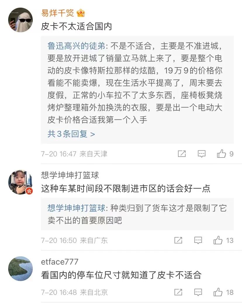 微博底下网友纷纷表示赞同,认为“皮卡不太适合国内”。