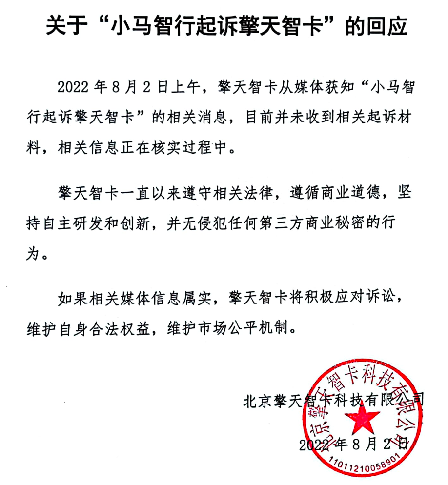 官方回应称,也是从媒体获知“小马智行起诉擎天智卡”的相关消息,目前并未收到相关起诉材料,相关信息正在核实过程中。