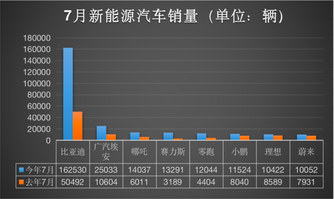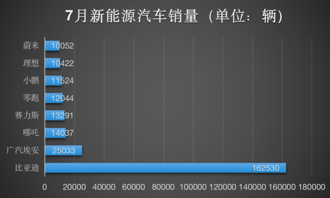 而且这几家的7月销量全部加在一起,一共是96,403辆,远远小于比亚迪的单月销量。