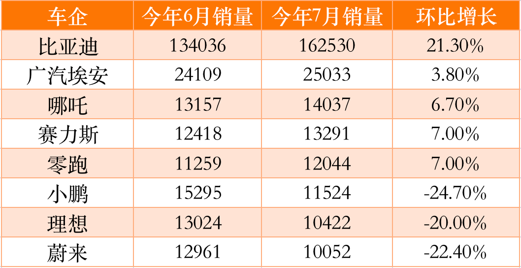 “蔚小理”三家环比6月都是负增长,广汽埃安、哪吒、赛力斯、零跑四家环比小幅增长,涨幅均不超过10%;唯独只有比亚迪环比增长超过了20%。