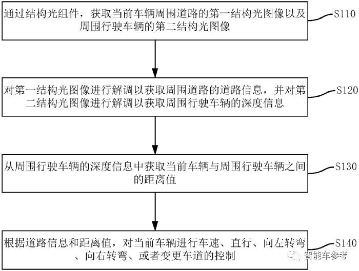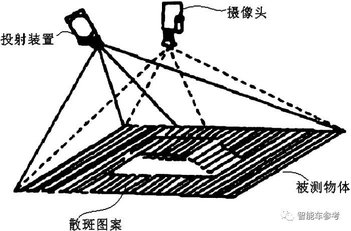 这个结构光组件包括了投射装置和摄像头。车辆行驶时,向周围道路和周围行驶车辆均投射散斑图案,用摄像头进行采集,得到周围环境和行驶车辆的深度信息。