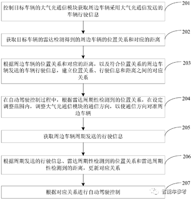 第二步,同时应用大气光通信模块和雷达探测器来确定目标车辆与周边车辆的位置关系和行驶信息,从而实现对目标车辆的自动控制。
